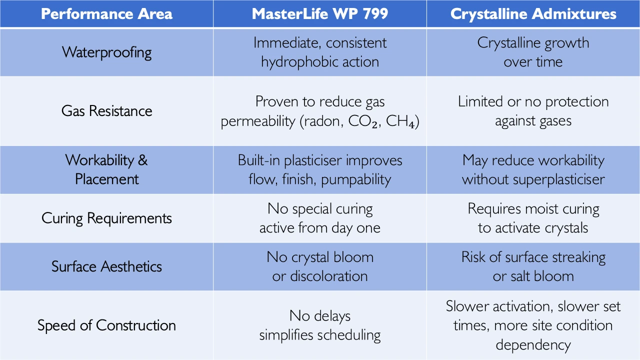 When it comes to WaterProofing concrete, not all admixtures are created equal. While crystalline systems have been widely used, they come with limitations that can compromise performance, installation speed, and finish quality. MasterLife WP 799 offers a new generation of integral WaterProofing technology—delivering faster, cleaner, and more effective results without the complications of traditional crystalline products.